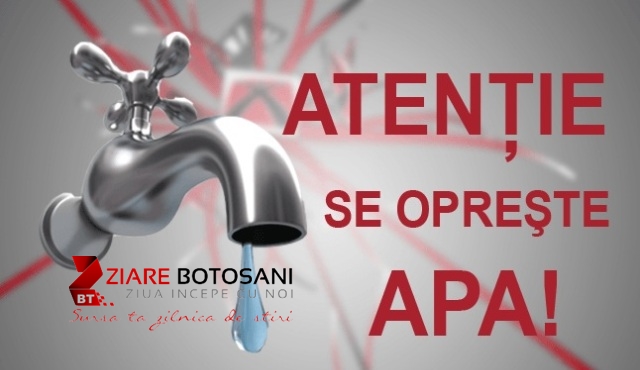 Din cauza unei avarii apărută la conducta de distribuție din Azbo Ø200 mm, localizată pe Aleea Nucului, S.C. Nova Apaserv S.A. Botoșani anunță că azi 30.07.2015, începând cu ora 9:00, întrerupe furnizarea apei în zona cuprinsă în perimetrul străzii Primăverii, Aleea Nucului și Aleea Scurtă.