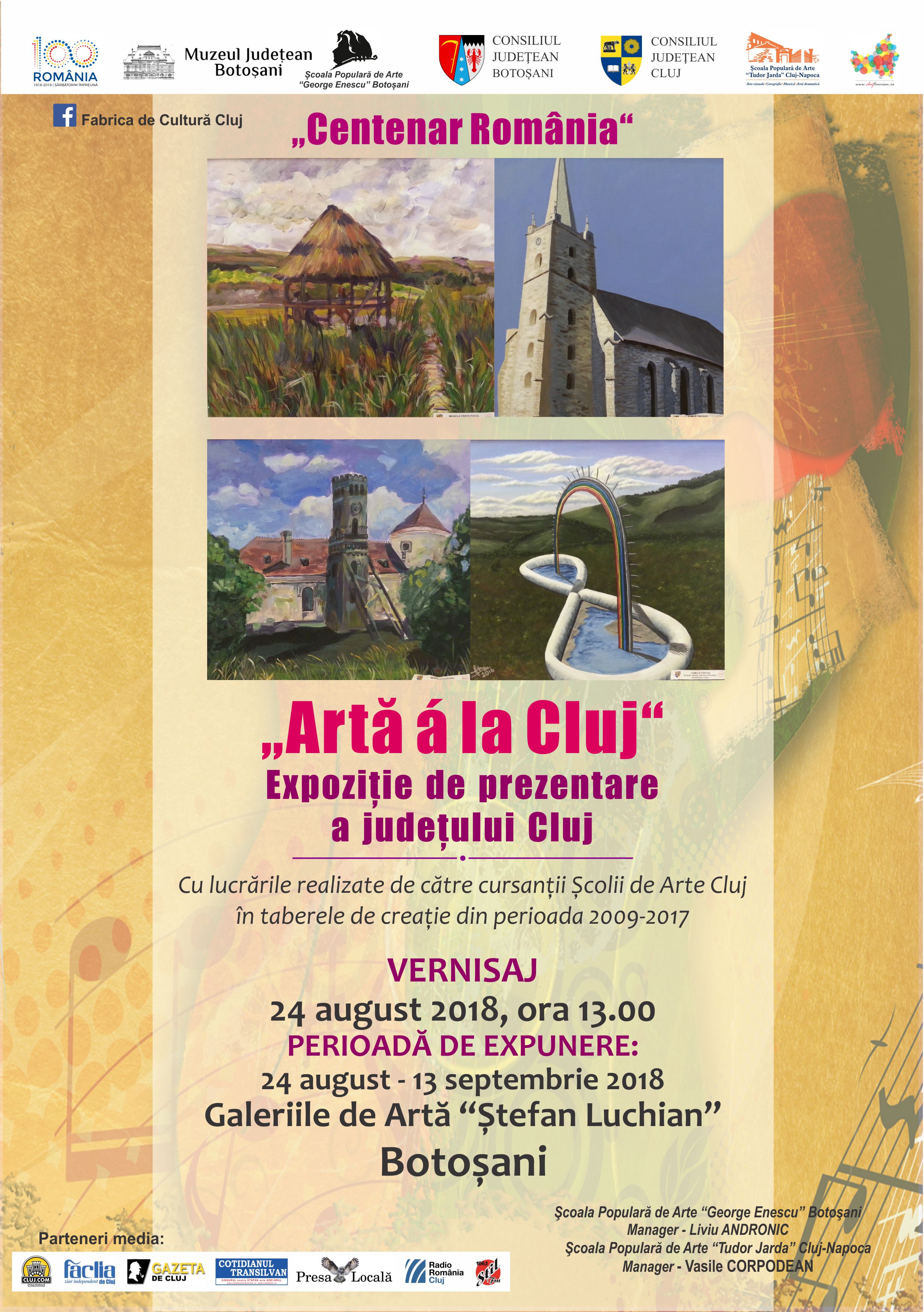 Sub egida „Centenar România”, Şcoala Populară de Arte Cluj, instituţie subordonată Consiliului Judeţean Cluj organizează, în perioada 24 august – 13 septembrie 2018, la Galeriile de Artă „Ştefan Luchian” din municipiul Botoşani, expoziţia de prezentare a judeţului Cluj, „Artă á la Cluj”.