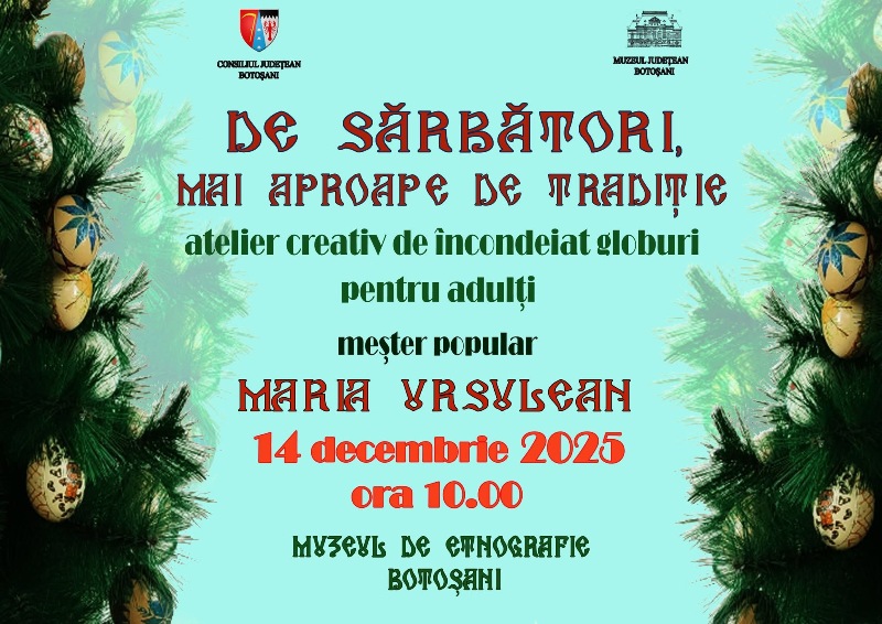 Muzeul Județean Botoșani desfăşoară, în data de 14 decembrie 2025, în intervalul orar 10.00 – 12.00, atelierele creative dedicate adulților intitulate „De sărbători, mai aproape de tradiţie”.