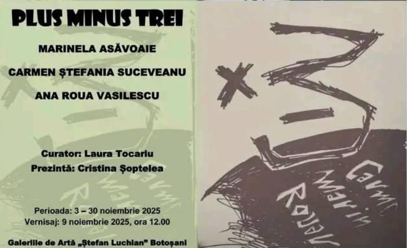 Muzeul Județean Botoșani găzduiește, în perioada 4-30 noiembrie 2025, în Galeriile de Artă „Ștefan Luchian” Botoșani, expoziția de grup „Plus minus trei”, cu lucrări semnate de artistele Marinela Asăvoaie, Carmen Ștefania Suceveanu și Ana Roua Vasilescu.
