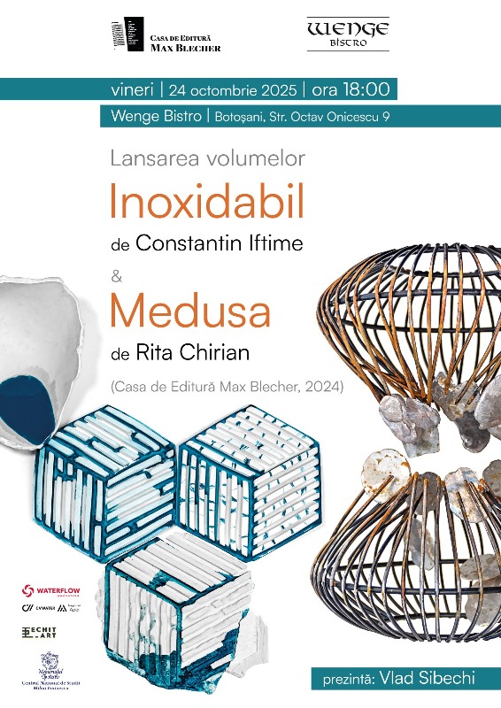 Casa de Editură Max Blecher, în parteneriat cu Memorialul Ipotești – Centrul Național de Studii „Mihai Eminescu”, vă invită vineri, 24 octombrie 2025, de la ora 18:00, în Wenge Bistro (Botoșani, str. Octav Onicescu nr. 9), la lansarea volumelor „Inoxidabil” de Constantin Iftime și „Medusa” de Rita Chirian. Evenimentul va fi moderat de Vlad Sibechi.