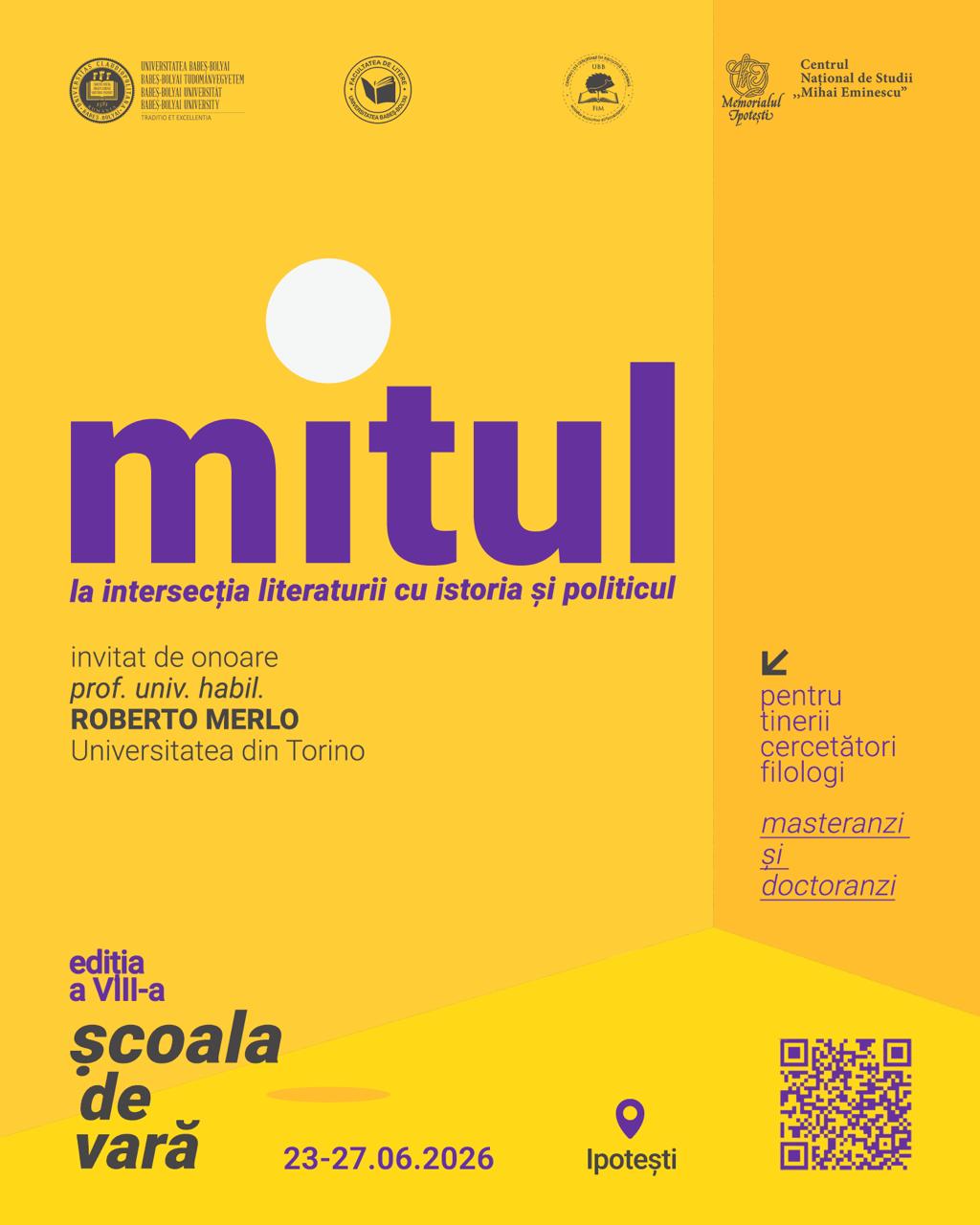 Universitatea Babeș-Bolyai (Facultatea de Litere, Departamentul de literatură română și teoria literaturii, Centrul de Cercetare în Filologie Modernă) și Memorialul Ipotești – Centrul Național de Studii Mihai Eminescu organizează, în perioada 23–27 iunie 2026, cea de-a VIII-a ediție a Școlii de vară dedicate tinerilor cercetători filologi – masteranzi și doctoranzi din întreaga țară.