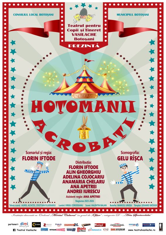 Vă invităm în această săptămână, în zilele de joi, 4 decembrie 2025, de la ora 18:00 și duminică 7 decembrie 2025, de la orele 11:00 și 12:30, la Teatrul pentru Copii şi Tineret „Vasilache” să vizionaţi în premieră spectacolul „Hoțomanii acrobați”. Scenariul şi regia artistică: Florin Iftode; scenografie, afiș, construcție păpuși: Gelu Rîșca; asistent regie: Ana Apetrei.