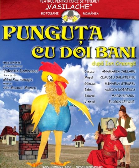 Teatrul pentru Copii şi Tineret „Vasilache” vă invită, duminică – 6 aprilie 2014 - de la orele 11 şi 12:30, să vizionaţi spectacolul „PUNGUŢA CU DOI BANI” de Ion Creangă, în dramatizarea şi adaptarea scenică a lui Valentin Dobrescu.