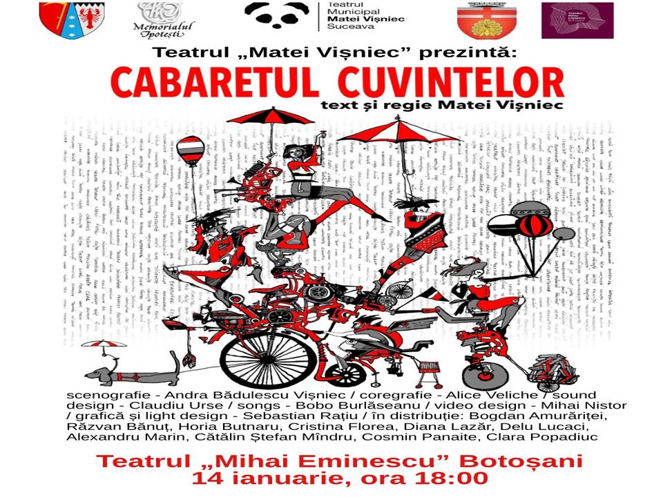 Memorialul Ipotești invită publicul, în data de 14 ianuarie 2026, ora 18:00, la spectacolul „Cabaretul cuvintelor”, susținut de actorii Teatrului „Matei Vișniec” pe scena Teatrului „Mihai Eminescu” din Botoșani.