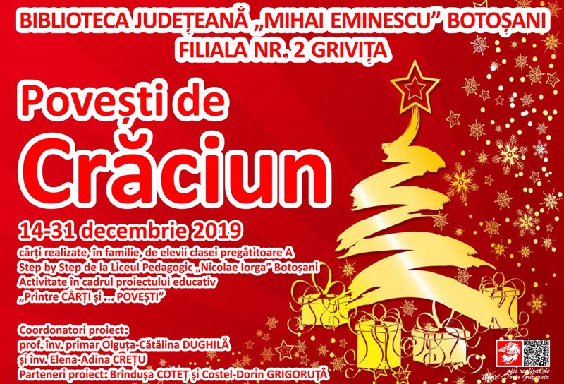 Dacă treceți pragul Bibliotecii Județene „Mihai Eminescu” Botoșani Filiala Nr. 2 Grivița în perioada 11 – 31 decembrie 2019, veți avea posibilitatea să descoperiți lumea minunată a poveștilor de Crăciun în expoziția de cărți realizate, în familie, de elevii Clasei Pregătitoare A Step by Step (Clasa „Veverițele istețe”) de la Liceul Pedagogic „Nicolae Iorga” Botoșani.