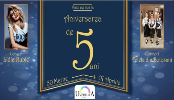 Cea mai apreciata locatie de shopping si entertainment din Botosani, Uvertura Mall aniverseaza in acest weekend 5 ani de canda adus pe piata botosaneana posibilitati nelimitate de petrecere a timpului liber, un comert la cele mai ridicate standarde de calitate si servicii complete, toate sub acelasi acoperis.