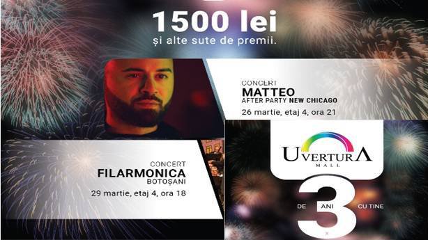 Succesul Uvertura Mall se datorează celor peste 3 milioane de vizitatori pe an, brandurilor existente și partenerilor. Aniversarea din acest an va fi marcată din weekend-ul antemergător datei de 29 martie, data oficială a deschiderii Centrului Comercial. Mai exact, pe data de 26 martie, la etajul 4 , începând cu ora 21:00, MATTEO va face show pentru toți cei prezenți. Concertul lui va continua cu un After Party organizat în incinta New Chicago. Seria evenimentelor continuă, iar în data de 29 martie, FILARMONICA Botoșani va susține un concert de excepție, începând cu ora 18:00, tot la etajul 4. La finalul concertului, botoșănenii prezenți se vor bucura de cel mai delicios moment al serii, pentru că nu vor lipsi tortul aniversar și șampania.