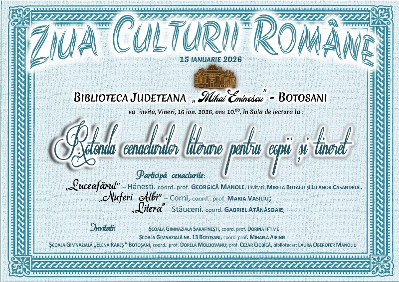 Vineri, 16 ianuarie 2026, începând cu ora 10,00, Sala de lectură a Bibliotecii va găzdui „Rotonda cenaclurilor literare pentru copii și tineret”, activitate devenită tradiție în programul manifestărilor organizate de instituție. Membrii cenaclurilor literare ”Nuferi albi”- Corni (coord. prof. Maria Vasiliu), ”Litera” – Stăuceni (coord. Gabriel Atănăsoaie), ”Luceafărul” – Hănești (coord. prof. Georgică Manole), alături de elevi talentați de la Școala Gimnazială ”Elena Rareș” Botoșani (coord. prof. Dorela Moldovanu și bibliotecar Laura Oberofer Manoliu), Școala Gimnazială nr. 13 (coord. Mihaela Airinei) și de la Școala Gimnazială nr. 1 Sarafinești (coord. prof. Dorina Iftime) vor recita din creațiile proprii și din opera eminesciană.