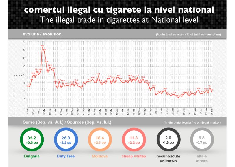 „În septembrie, se înregistrează reduceri ale comerțului ilicit în aproape toate regiunile țării. Astfel, cea mai semnificativă scădere este notată în zona de sud-vest, cu 8,5 p.p. față de septembrie, până la 10%. De asemenea, în regiunea de vest contrabanda scade cu 5,1 p.p. până la 10,1%, comparativ cu cercetarea precedentă. Pe de altă parte, în zona de sud a țării se înregistrează o majorare de 5,1 p.p. a comerțului ilegal, până la 16,2%, în luna septembrie. Din punct de vedere al provenienței produselor, prima sursă pentru piața neagră din România rămâne Bulgaria cu 35,2%, în creștere ușoară cu 0,6 p.p. comparativ cu iulie, urmată de Duty free cu 26,3% și Moldova cu 18,4%”, a declarat Marian Marcu, Director General Novel Research.