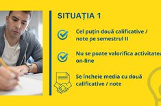 Situația 2: dacă elevul are cel puțin două calificative/note în semestrul al II-lea și i se poate valorifica activitatea on-line, atunci situația școlară semestrială se poate încheia și cu mai mult de două calificative/note.
