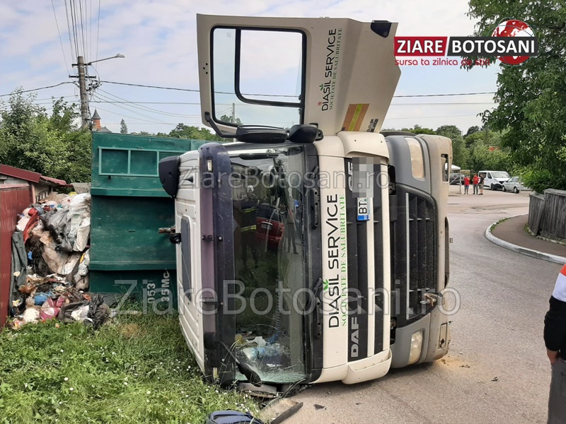 Accident la Dorohoi! Un camion care transporta deșeuri s-a răsturnat pe strada Luceafărul - FOTO