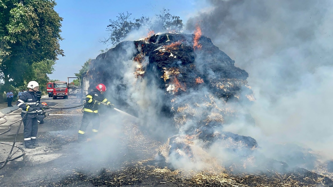 Camion încărcat cu baloți de paie cuprins de un incendiu. Pompierii au intervenit de urgență - FOTO