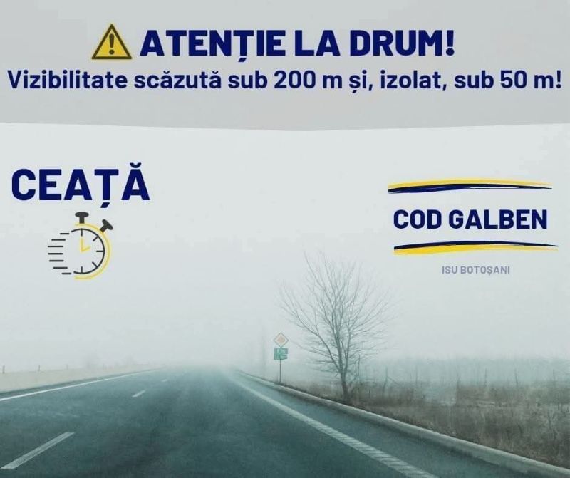 Conduceți prudent! Meteorologii au emis un cod galben de ceață valabil astăzi, 7 noiembrie 2025, pentru județul Botoșani.