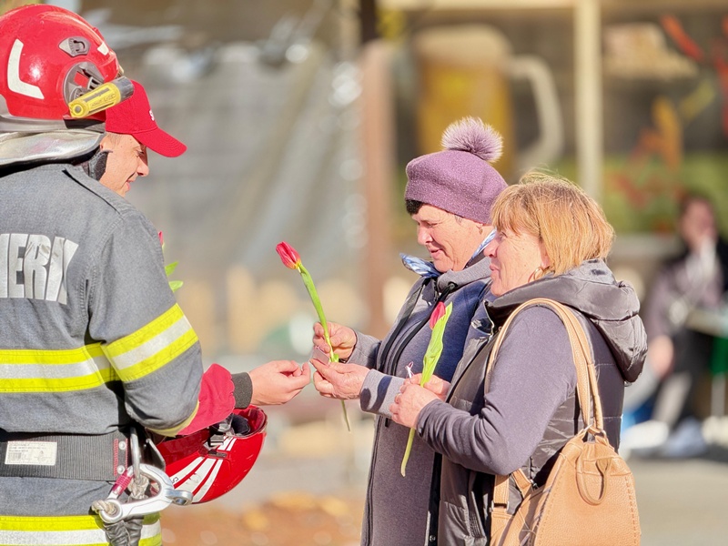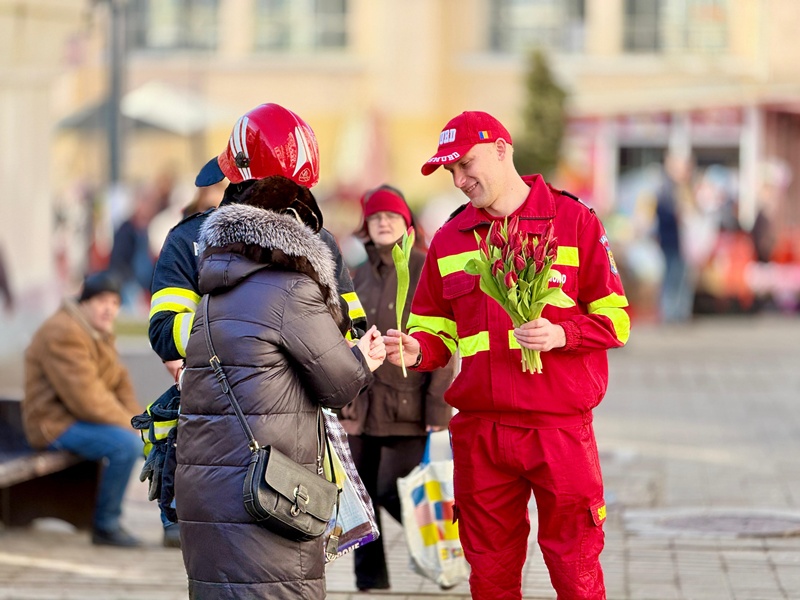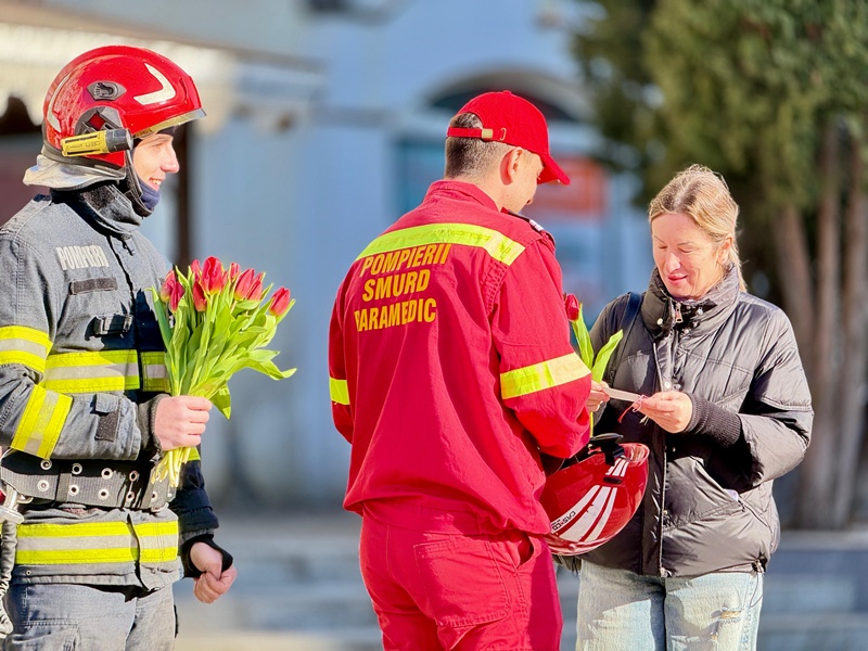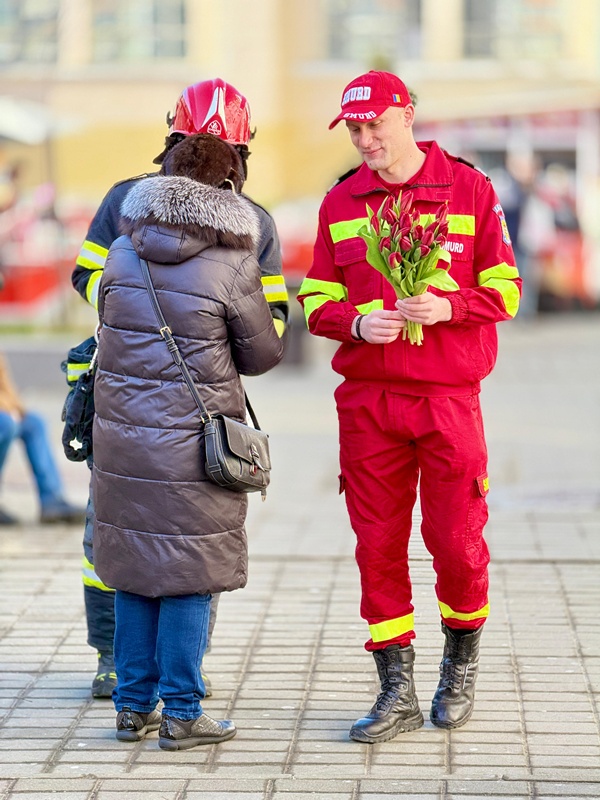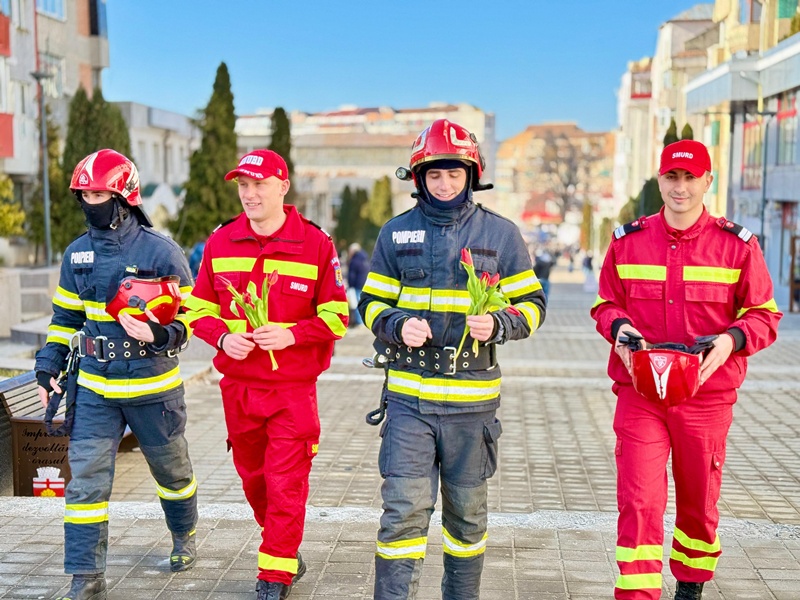 Pompierii botoșăneni au adus zâmbete și flori în Piața Centrală din Botoșani, cu ocazia Zilei Internaționale a Femeii.