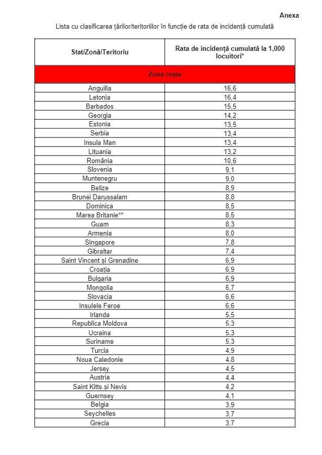 Art.1 – (1) Se aprobă Lista cu clasificarea țărilor/teritoriilor în funcție de rata de incidență cumulată, prevăzută în anexa care face parte integrantă din prezenta hotărâre, în vederea stabilirii persoanelor care sosesc în România din acestea și cu privire la care se instituie măsura carantinei.