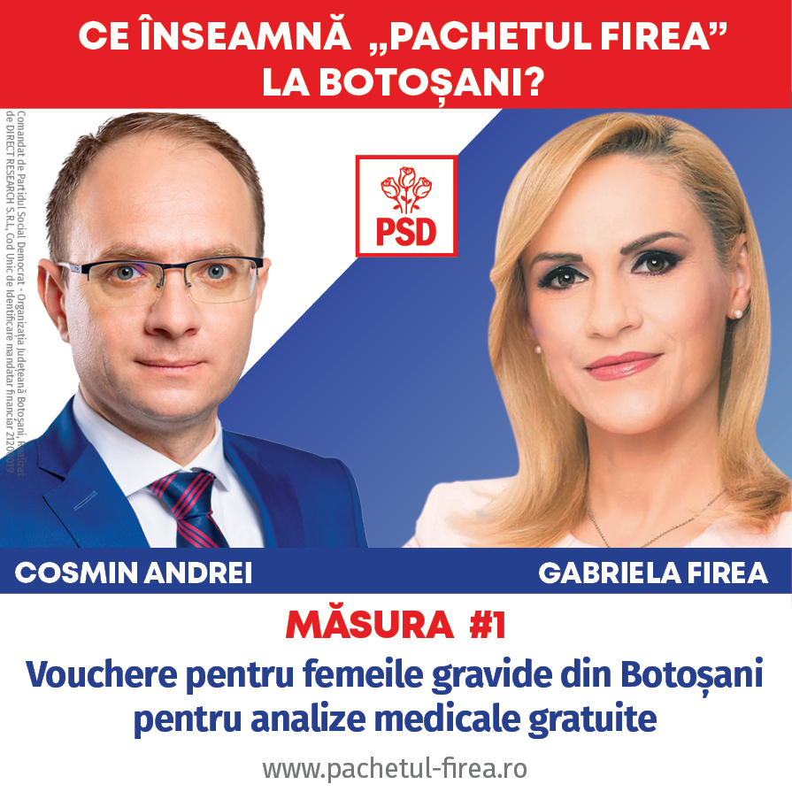 „I-am solicitat de mai multe ori lui Cătălin Flutur să declare public dacă susține Pachetul social „Gabriela Firea" la Botoșani, prin care sunt propuse măsuri de prevenție medicală pentru copii și femei și măsuri de stimulare a natalității în rândul familiilor din orașul nostru. Până în prezent, domnul Flutur nu a dat niciun răspuns, ceea ce înseamnă că nu susține aceste programe pentru protejarea sănătății mamelor și copiilor, așa cum a făcut și în ultimii 4 ani, când a ignorat total sistemul de educație și sănătate din orașul nostru”, a declarat Cosmin Andrei.