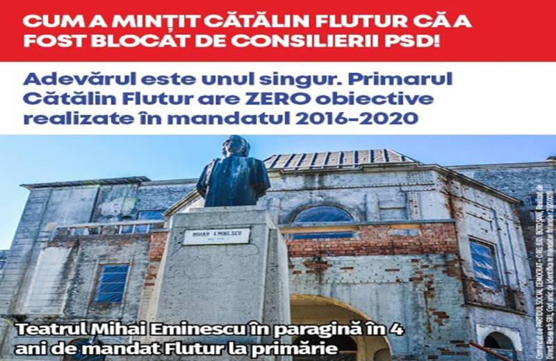 Un alt mare proiect adoptat cu mai multe voturi din partea PSD este consolidarea și restaurarea Teatrului Mihai Eminescu. Deci eșecul în finalizarea acestui obiectiv îi aparține exclusiv primarului Cătălin Flutur, care la învestirea sa din 2016 acuza PSD că nu a fost în stare să termine reabilitarea teatrului.